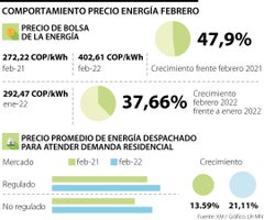 Según lo informado por XM, en febrero de este año, el precio promedio ponderado de bolsa de la energía fue de 402,61 COP/kWh, lo cual representó un aumento del 47,90% con respecto al reportado para el mismo mes del 2021. Al comparar con el mes anterior (enero), donde el indicador cerró en 292,47 COP/kWh, el alza fue de 37,66%.
