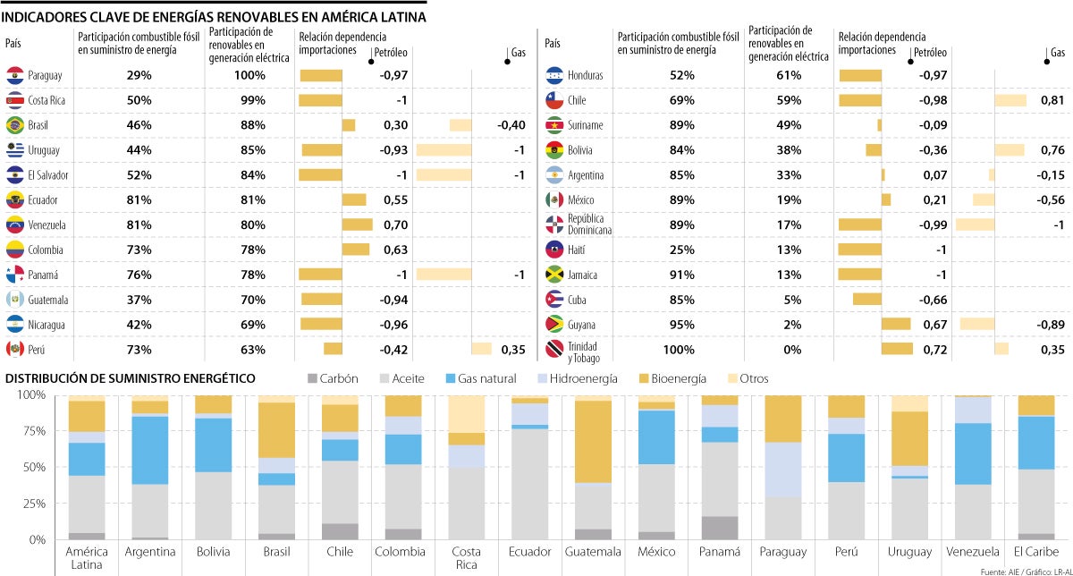 En el reporte se destaca a Paraguay, Costa Rica, Brasil, Uruguay, El Salvador, Ecuador, Venezuela, Colombia y Panamá como los países que en la actualidad le apuestan más a los renovables en su generación de energía. Y es que Paraguay ya cubre 100% de su demanda con energía hidroeléctrica, suministrada principalmente por la central eléctrica de Itaipú.
