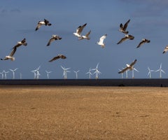 Foto:Seagulls take flight from the beach backdropped by offshore wind turbines at the Scroby Sands Wind Farm, operated by E.ON SE, near Great Yarmouth, UK, on Friday, May 13, 2022. The UK will introduce new laws for energy to enable a fast build out of renewables and nuclear power stations as set out in the government’s energy security strategy last month.