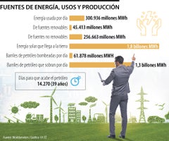Los datos arrojan que el mundo utiliza cada día 300.936 millones de MW/h; y de energías renovables, principalmente solar y eólica, se aprovechan 45.413 millones de MW/h
